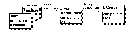 During design, the Component Builder imports the stored procedure metadata, then creates and deploys the component into EAServer.
