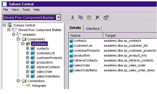 The Stored Proc Component Builder lets you easily create EAServer components that invoke existing stored procedures. Like all AI Component Builders, the Stored Proc Component Builder runs in Sybase Central, a system management and design tool.