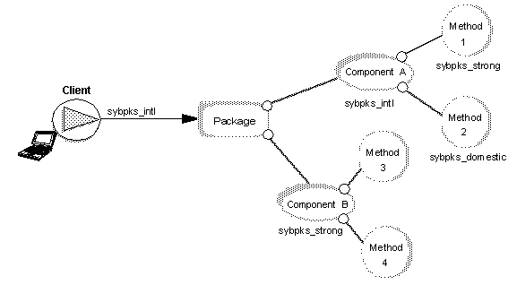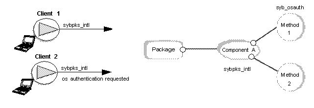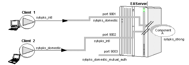 Figure 2-1 illustrates two clients trying to access component A. A QOP of sybpks_strong is set for the component. To access the component, the client must use a QOP that meets the minimum requirements of the component's QOP, and communicate with a listener that also meets the minimum requirements of the component's QOP.